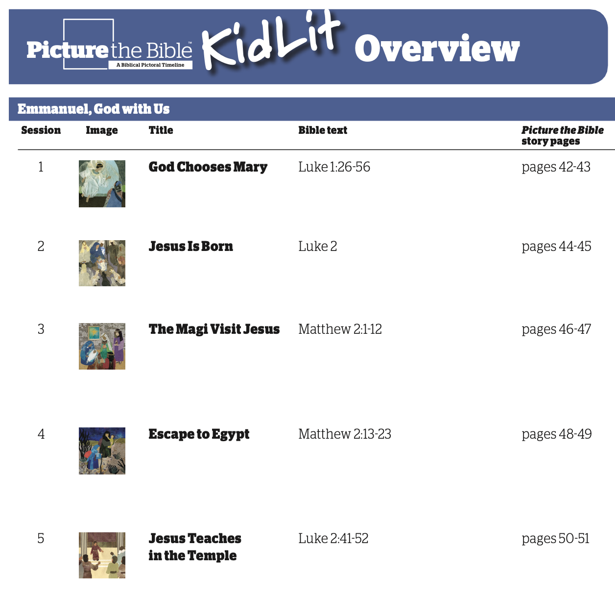 Emmanuel, God with Us is the fourth unit in the KidLit series. This set of lessons explores five stories surrounding Jesus’ birth, from the Annunciation through Jesus Teaches in the Temple