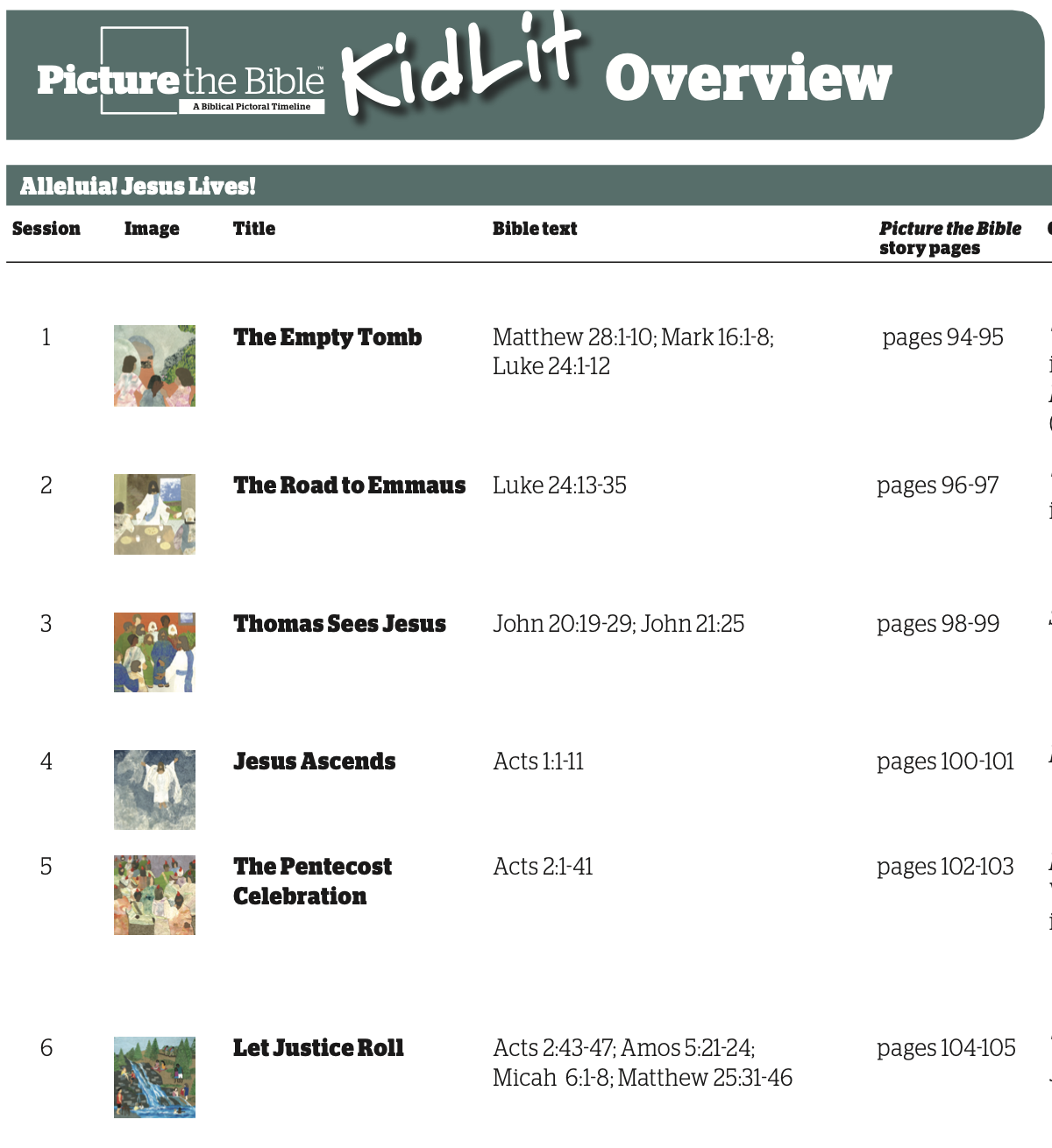 Alleluia! Jesus Lives! is the final of seven units in the KidLit series. This set of lessons begins at Easter with The Empty Tomb and includes stories of Emmaus, Thomas, and Pentecost. It ends with a vision for how we can live in God’s Way with a lesson from Micah, Amos, and Matthew.