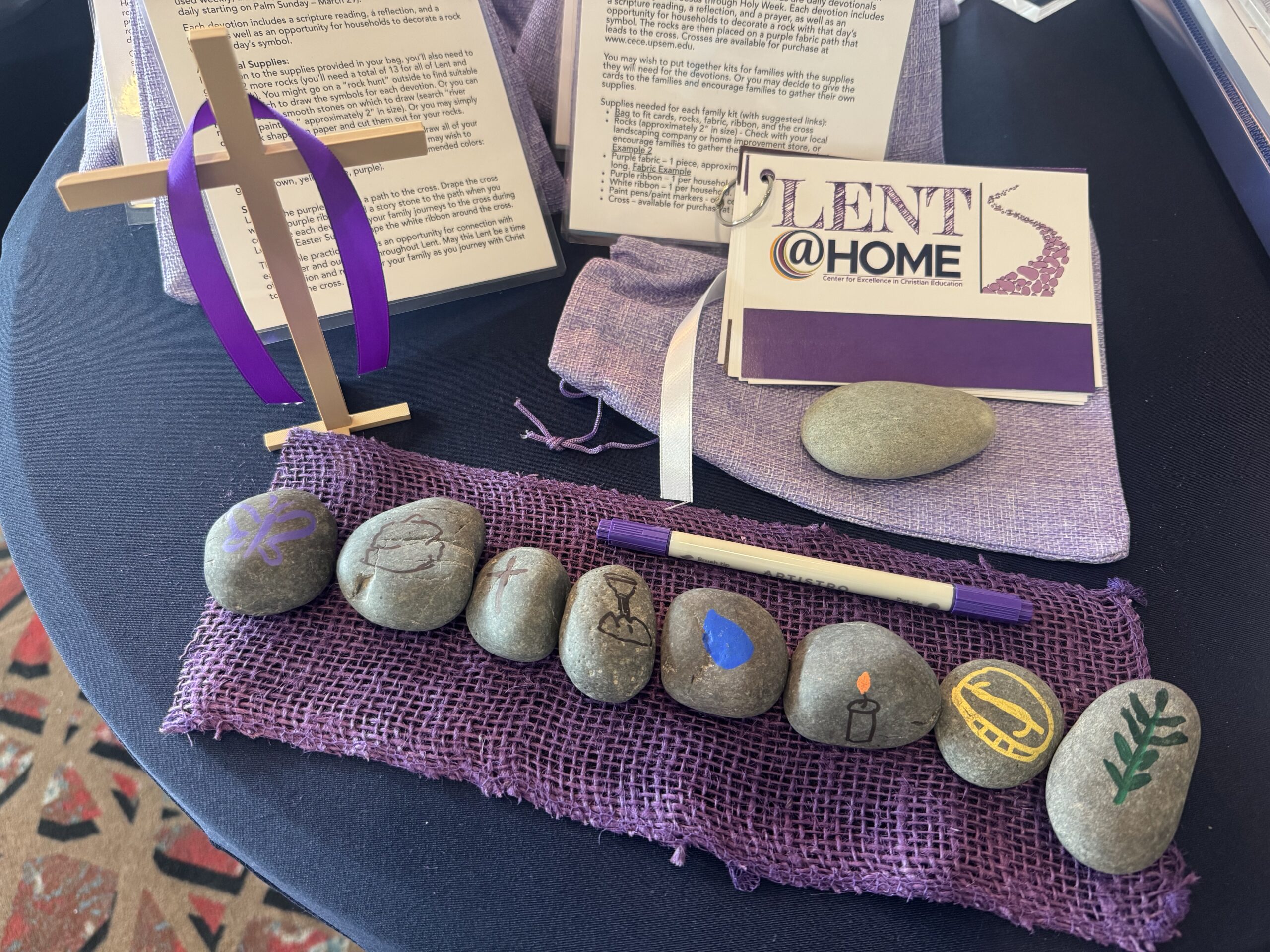 Families will need a bag with the @Home cards, 13 rocks, purple fabric, white and purple ribbon, and a cross (additional crosses are available for purchase here). Examples of supplies needed to complete the bags are included in the physical kit (1 set). A full supply list with links is included in the digital download.