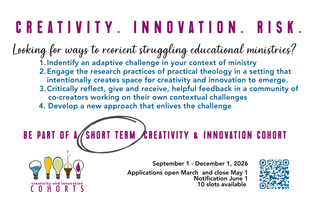 Creativity and Innovation Cohorts convenes practitioners who want to develop new approaches to adaptive challenges in educational ministries Cohort may have a multiple people working on their own projects or a singular focus for the whole cohort. Collectively, the Cohort will be guided through a variety of practical theology research processes as they work through the adaptive challenge. These will include